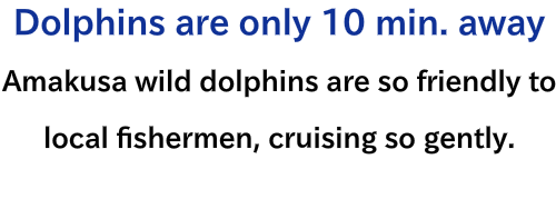 Dolphins enjoy every season of the year. The baby dolphins show up with playful jumps in Spring. The strong sunlight in Summer deepens blue in water, and dolphins become so active. The autumn is dolphins` chill time with peaceful sunset. When big swells hit Amakusa in winter, they just love playing with the waves. After departure, it takes only 10 minutes to meet dolphins. Invite your friends and family for a journey to share beautiful world with dolphins!